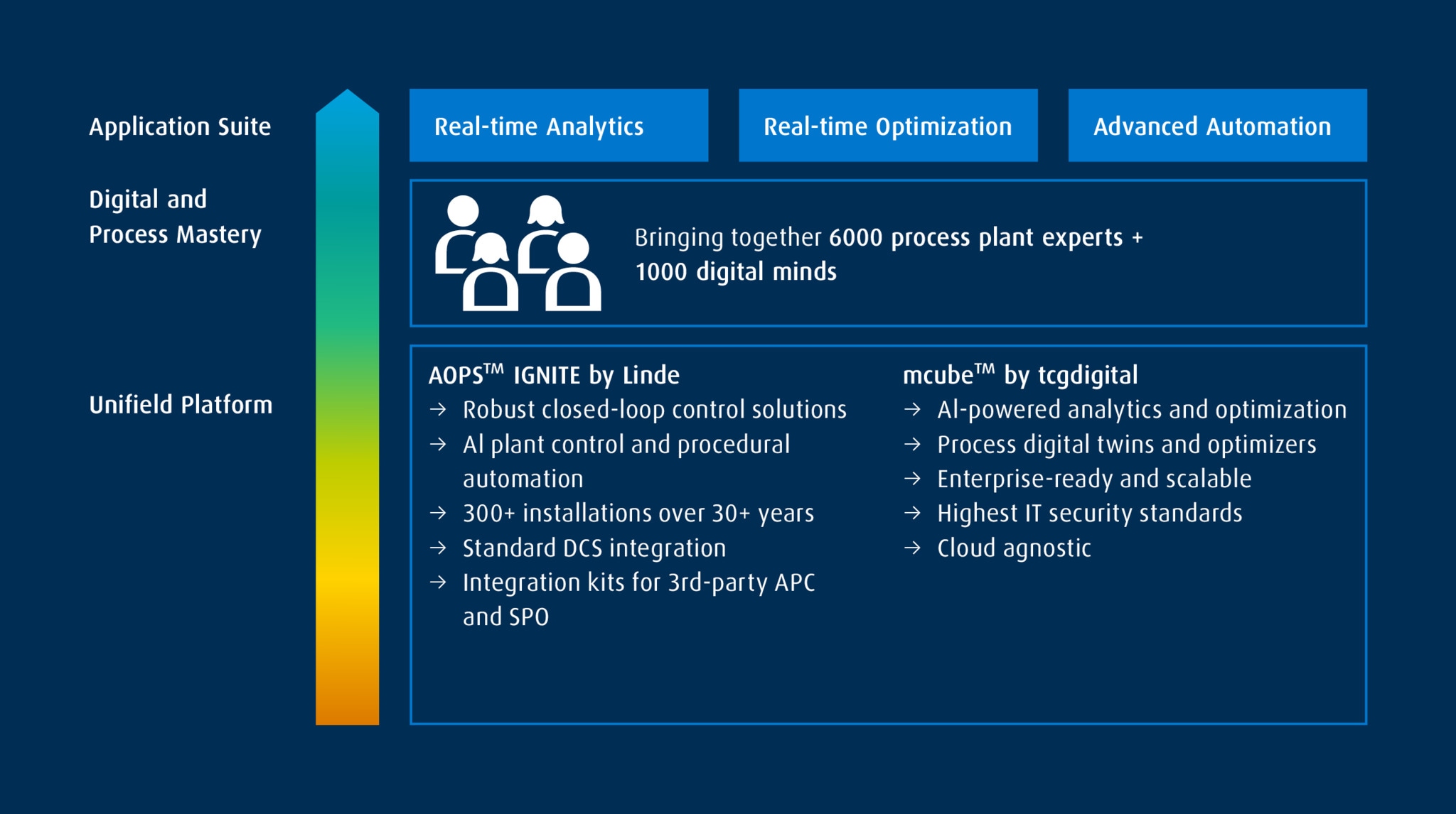 Tap into the synergies created by the alliance between our process plant experts and TCG Digital's AI innovators. Combining decades of expertise, our integrated application portfolio will help you maximize asset performance, drive EBIT, increase reliability and simplify operations.