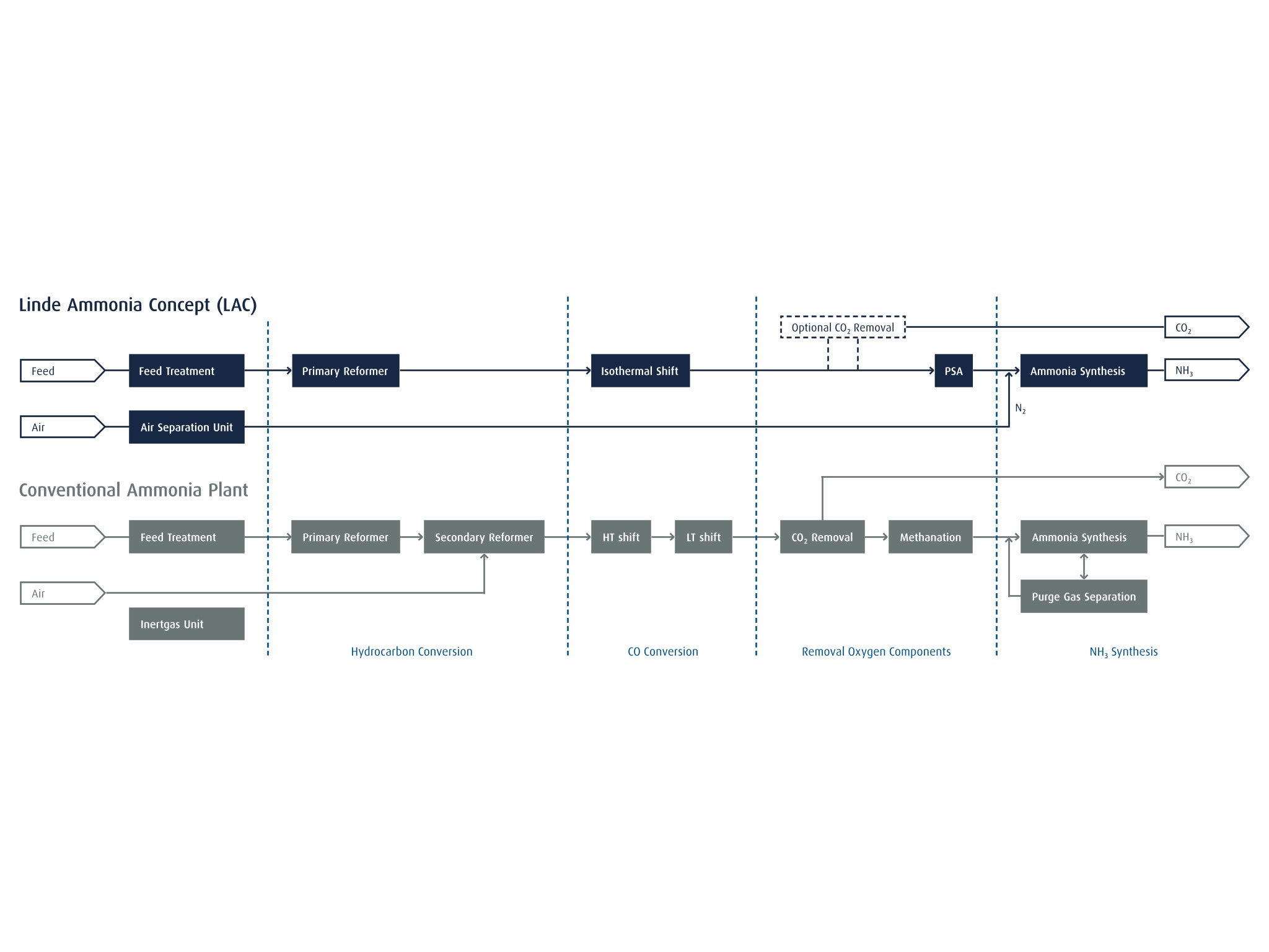 The LAC process simplifies the conventional NH3 path (see graphics below). By replacing air with pure N2, LAC minimizes the accumulation of residual inert impurities such as argon (Ar) and methane (CH4) in the ammonia reactor. This avoids the need for syngas purges and a purge gas separation step. Moreover, the use of inert-free synthesis gas intensifies the NH3 synthesis reaction, which means less catalyst volume is required in the NH3 converter relative to conventional plants. Depending on individual requirements, an optional carbon dioxide (CO2) removal step can be integrated with the LAC process.