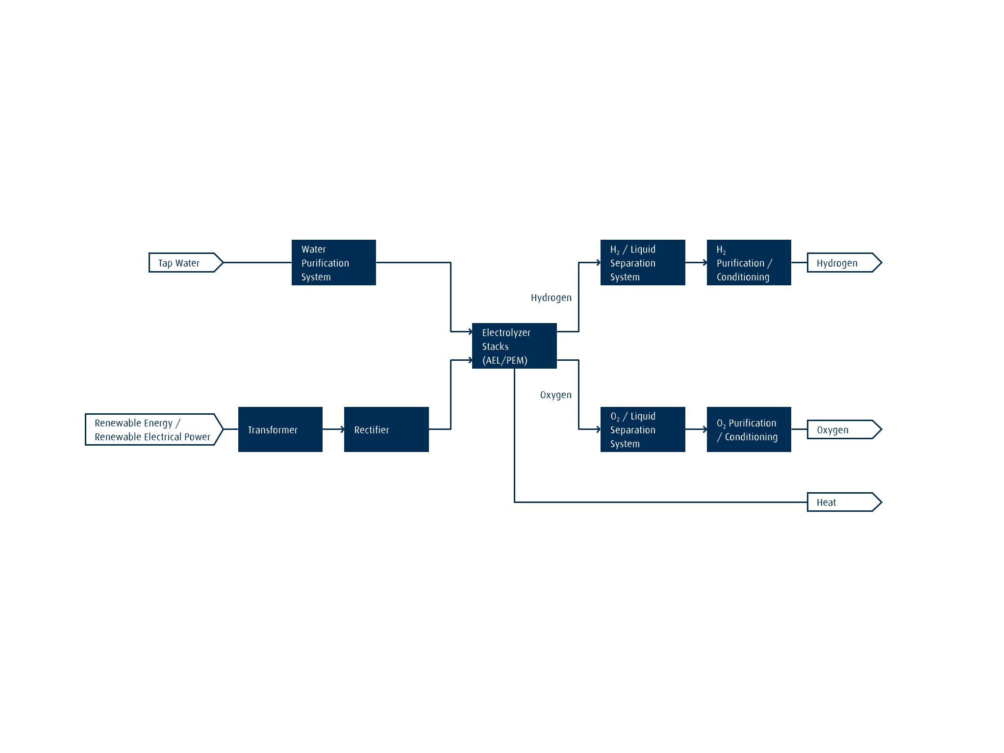 The illustration on the bottom shows how green H2 could be produced using a PEM electrolyzer. Purified water and renewable power are supplied to the electrolyzer module, which can contain several separate electrolyzer stacks. The water is electrochemically split into H2 and O2. The resulting H2 is then dried and purified.